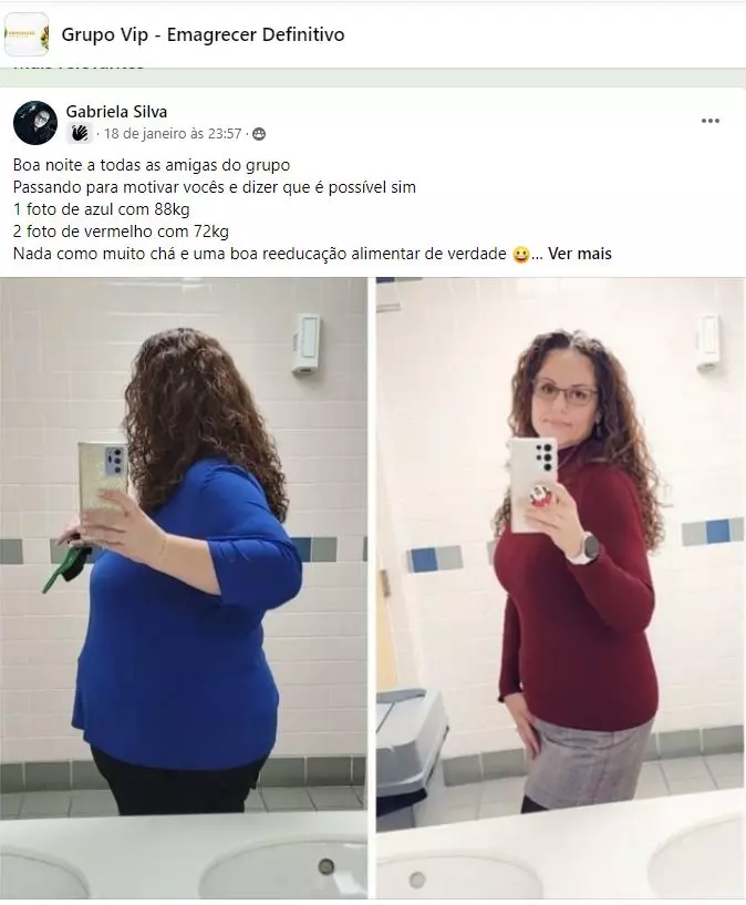 “O Guia Emagrecer Definitivo, além de te fazer secar, mesmo após a gravidez, proporciona a você mais saúde e disposição para os desafios do cotidiano. É o programa perfeito para mamães que assim como eu, mesmo na correria, buscam voltar ao corpo que tinham antes com muito mais energia. Recuperei minhas antigas roupas que usava, e amei o chá. Muito obrigada!”