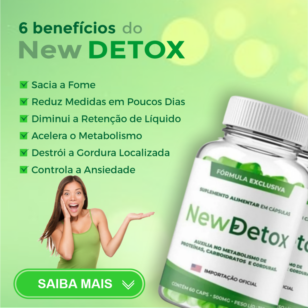 New Detox é um poderoso suplemento que acelera o seu metabolismo, diminui o inchaço e a retenção, elimina as substâncias inflamatórias e te faz emagrecer de forma rápida, saudável e definitiva.